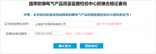 沈陽頒發(fā)的防爆合格證查詢網(wǎng)址:http://www.fbdqhy.com/hgz_search.aspx